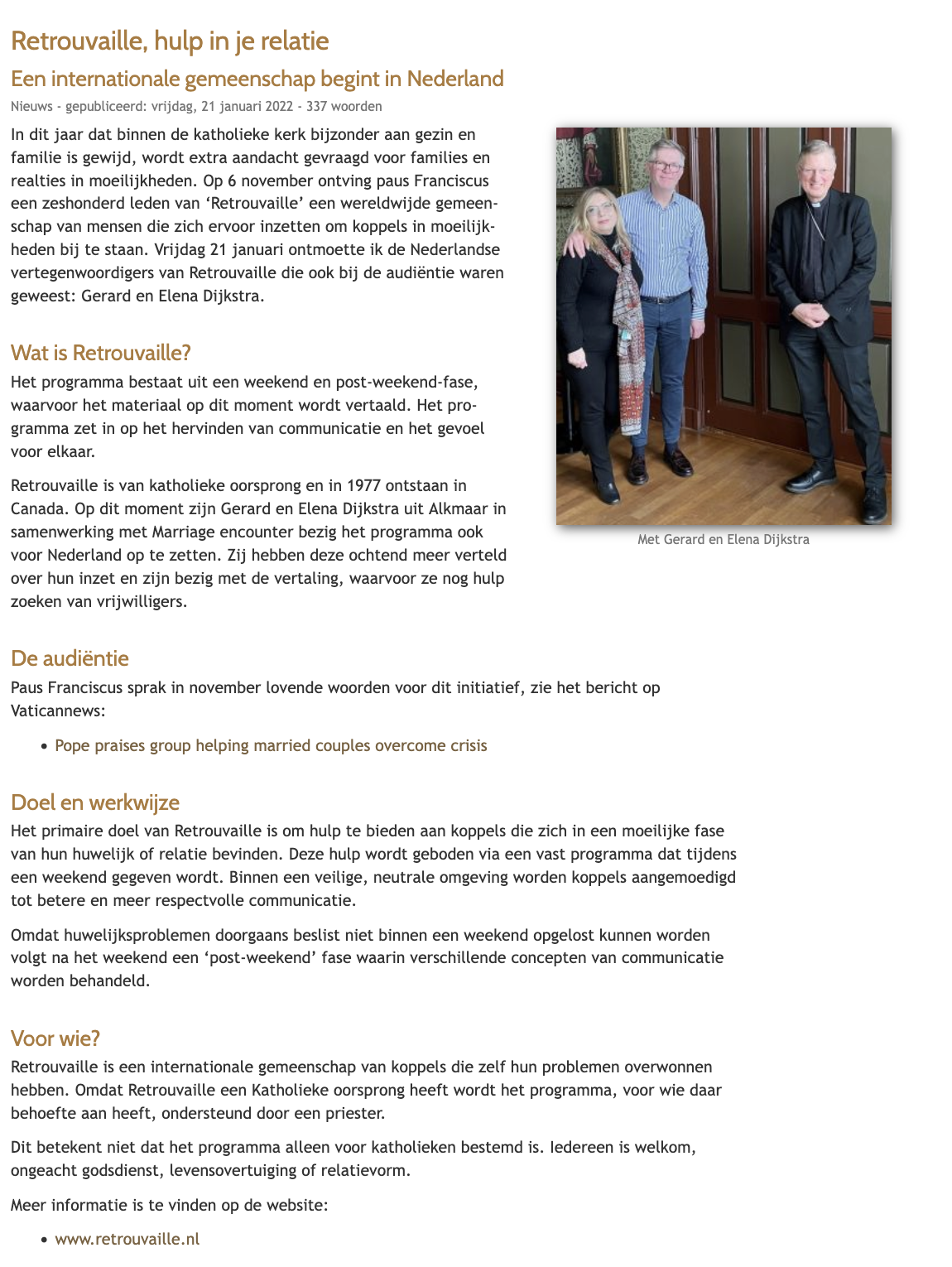 Inhoud: Alkmaars stel introduceert Retrouvaille in Nederland